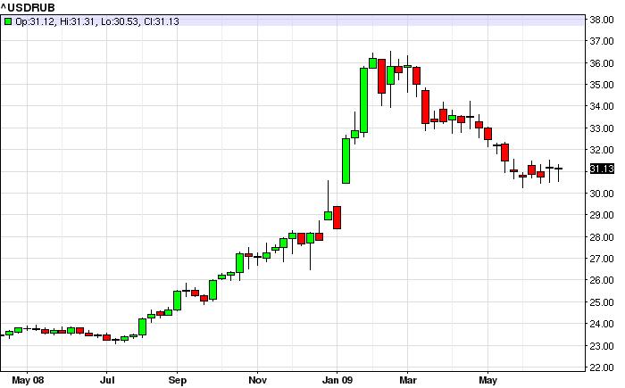 Поэтому нужно понимать, что выход из кризиса идет, но не под бравурные марши фанфар, а под сложные мучительные процессы поиска как глобальных, так и локальных решений. Я полагаю, что ряд стран еще надолго задержится в кризисных явлениях, и скорей всего, это будут страны Восточной Европы, и ряд стран Западной Европы. Совершенно естественно, что резкий рост рынка, который начался значительно раньше позитивных перемен в реальной экономике, вызвал всплеск спекулятивных настроений на сырьевые ресурсы. И начала расти цена на нефть. Спекулятивный фактор был столь очевиден, что меня здорово удивили высказывания ряда экономистов, что мы скоро увидим цену на нефть чуть ли не $400 за баррель. Посмотрите ниже график цен на нефть. Стоит отметить, что последний кризис уже вызвал ряд процессов в экономике, которые принимают необратимые явления. В частности, идет усиленный поиск альтернативных источников энергии. И недавно было объявлено, что ряд японских автомобильных корпораций готов к поставкам электромобилей. Аналогичные процессы идут на заводах автопрома США, которые провели серьезное перепозиционирование в последние дни, включая и банкротство, и возрождение. И что-то сдвинулось с места. На фоне кризиса и новых тенденций, цена на нефть никак не может расти под давлением тех же сил, что были до кризиса. И потому после роста, цена на нефть приостановилась. Я предполагаю, что она должна надолго задержится на сегодняшнем уровне, а, возможно, и скатиться еще ниже. Несколько стабилизировались котировки валют. Посмотрите ниже графики кросс-курсов рубль-доллар и евро-доллар.